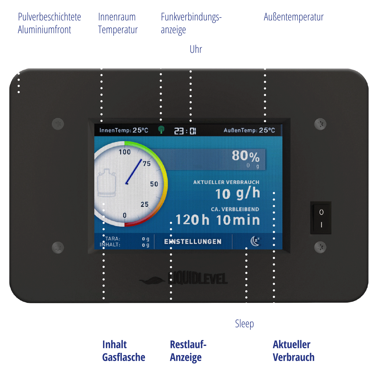 Die Steuerung erfolgt ganz einfach und intuitiv optional über ein Touch Display und/oder Ihrem Smartphone. So lassen sich alle Einstellungen kinderleicht vornehmen. Das Bedienteil kann entweder über das mitgelieferte 220V-Netzteil oder eine USB-Steckdose betrieben werden. Der Messsensor wird direkt unter die Gasflasche gestellt und mit dem 12V-Bordnetz verbunden oder als Grill-Edition per Powerbank in Ihrem Grill betrieben. Er verfügt über zwei Führungsringe auf die sowohl 5 kg als auch 11 kg Stahl- oder Aluminum-Gasflaschen passen. Damit sind alle gängigen Flaschengrößen abgedeckt.